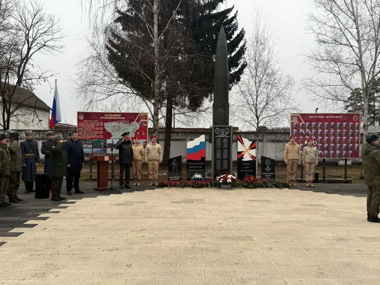 Гости возложили цветы к мемориалу военнослужащим артиллерийской бригады, погибшим в ходе выполнения боевых задач в зоне СВО. Мемориал был торжественно открыт 19 ноября 2025 года, в День ракетных войск и артиллерии. В его открытии приняли участие вдовы и члены семей погибших военнослужащих, представители АО «Коломенский завод», которые оказали помощь в изготовлении элементов мемориала.