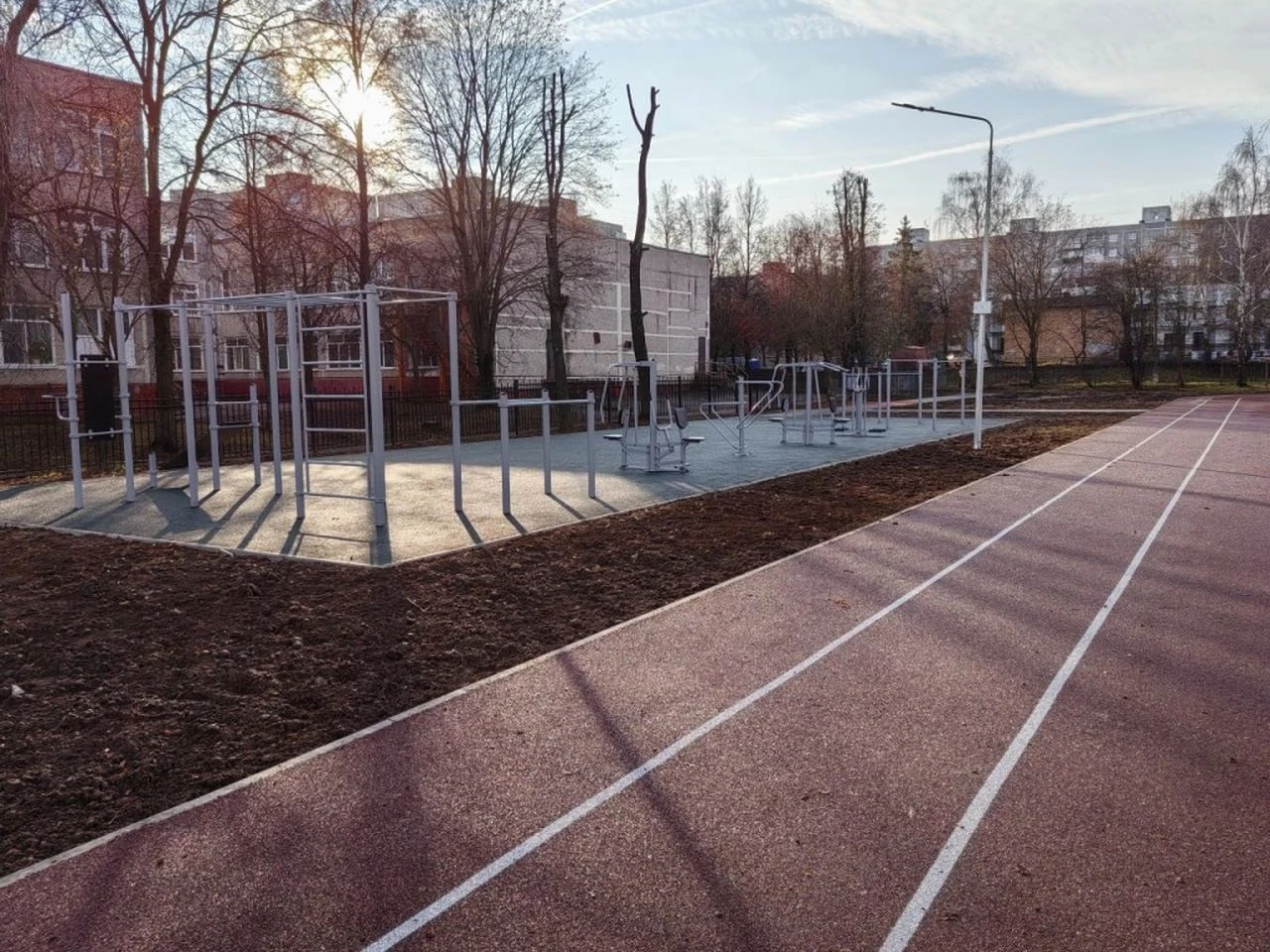 После масштабного благоустройства территория школьного стадиона полностью преобразилась. На площадке уложили новые беговые дорожки общей протяженностью 400 м, включая кольцевую длиной 300 м и прямую стометровку, а также оборудовали зоны для футбола, баскетбола и волейбола.