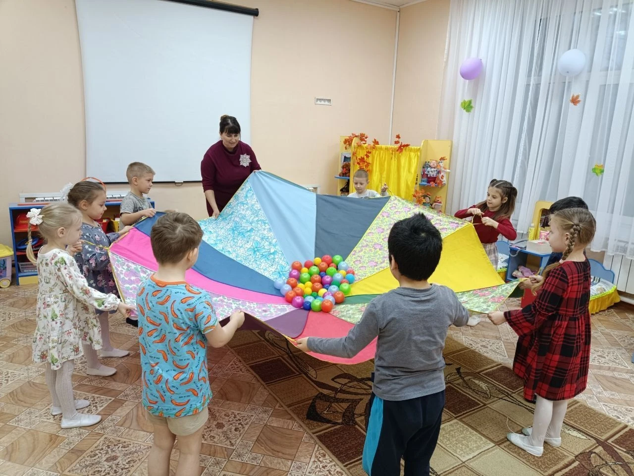 Занятия проходили в игровой форме. Для детей были организованы тренинги с использованием игрового парашюта и «Коврика настроения». Цветной коврик продолжает оставаться любимым элементом занятий: он помогает ребятам выражать чувства, улучшает настроение и вносит атмосферу радости в коллектив. Во время игр дети с интересом фантазировали, представляя «полянку», «море», «теремок» и другие образы, а также вместе с педагогами разыгрывали воспитательные сюжеты.